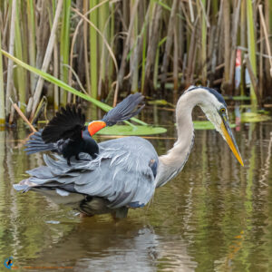 Heron vs Blackbird – Héron vs Carouge (7/10/2022) - A Red-winged blackbird fiercely defends its territory - Un Carouge à épaulettes défend son territoire.